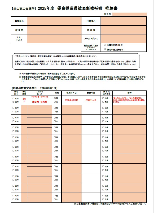 津山商工会議所 2025年度優良従業員候補者推薦のご案内
