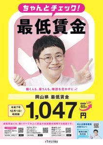 岡山県最低賃金が令和7年12月1日から時間額1,047円に改定されました。